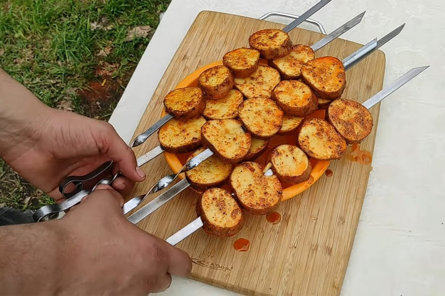 Картофель на гриле может стать дополнением к мясному шашлыку или самостоятельным блюдом. Молодой картофель с чесноком и специями получается румяным снаружи и мягким внутри. Совет: выбирайте картофелины небольшого размера, чтобы они прожаривались равномерно.
