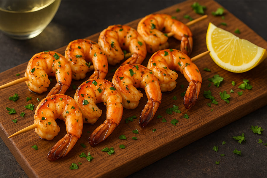 Креветки важно правильно замариновать, чтобы они не потеряли сочность. Хороший вариант — лимон с оливковым маслом и чесноком. Такая смесь придаёт морепродуктам нежный вкус и аромат. Советуем брать крупные креветки и готовить на шпажках. И помните, что креветки жарятся очень быстро, так что не спускайте с них глаз!