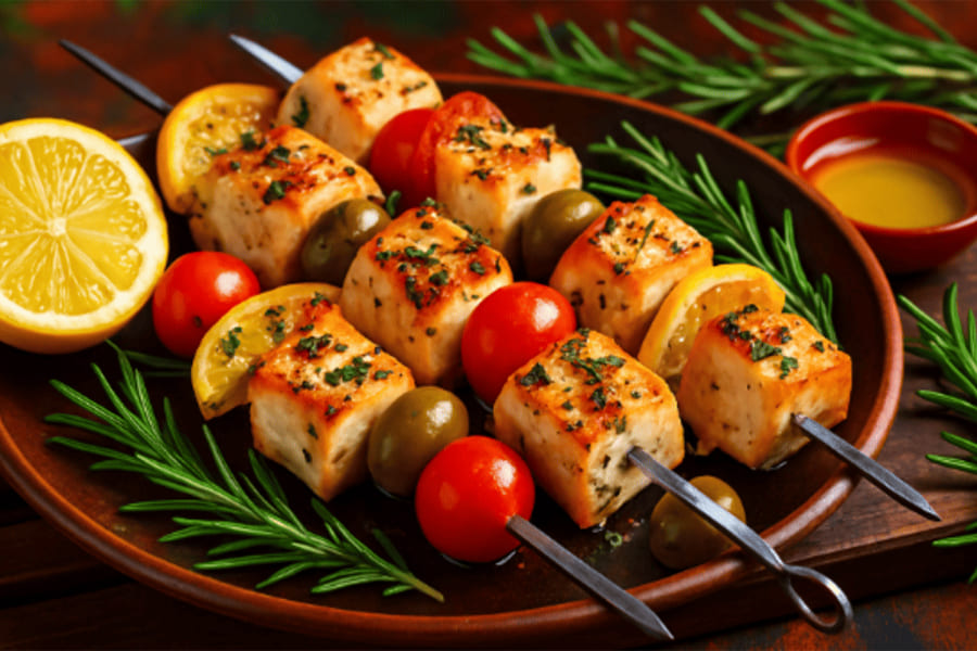 - Насадите рыбные кусочки на шпажки, жарьте примерно по 3 минуты с каждой стороны.