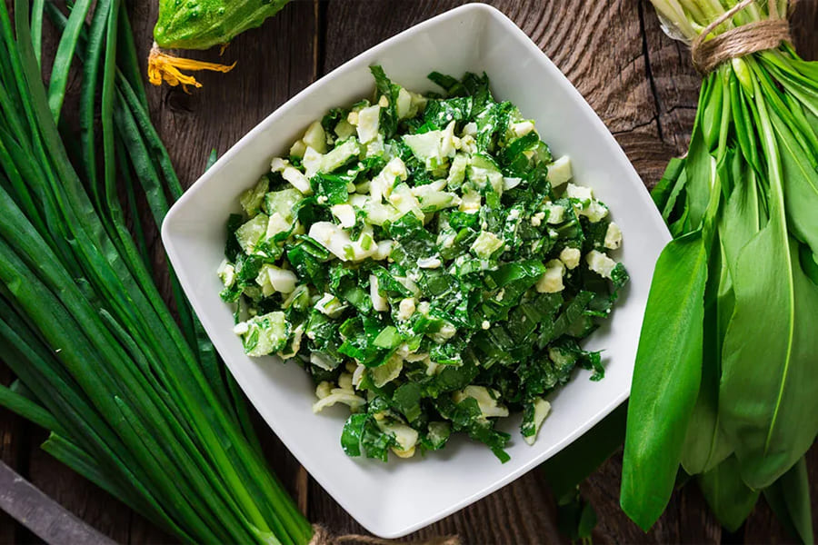 Весенний свежий салат с черемшой быстро готовится и может подаваться как гарнир к основному блюду. Молодая ароматная черемша хорошо сочетается с сочными хрустящими огурчиками, а варёные яйца придают сытность.