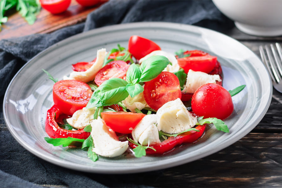 Весенний салат с оливковым маслом в итальянском стиле. Свежие помидоры кисло-сладкие: они отлично сочетаются со сливочным вкусом моцареллы. А лук придаёт блюду остроту и пикантность.