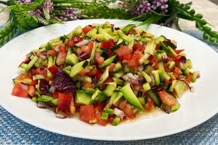 Яркий и пикантный весенний овощной салат не оставит равнодушными любителей остренького. Его можно подавать как гарнир к мясным блюдам или завернуть в тортилью или лаваш.
