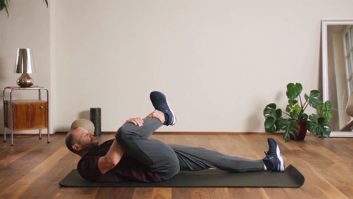 Лягте на спину на коврик или прямо на пол. Возьмитесь за правую ногу и подтяните правое колено вверх так, чтобы верхняя и нижняя части ноги образовали угол примерно 90 градусов.